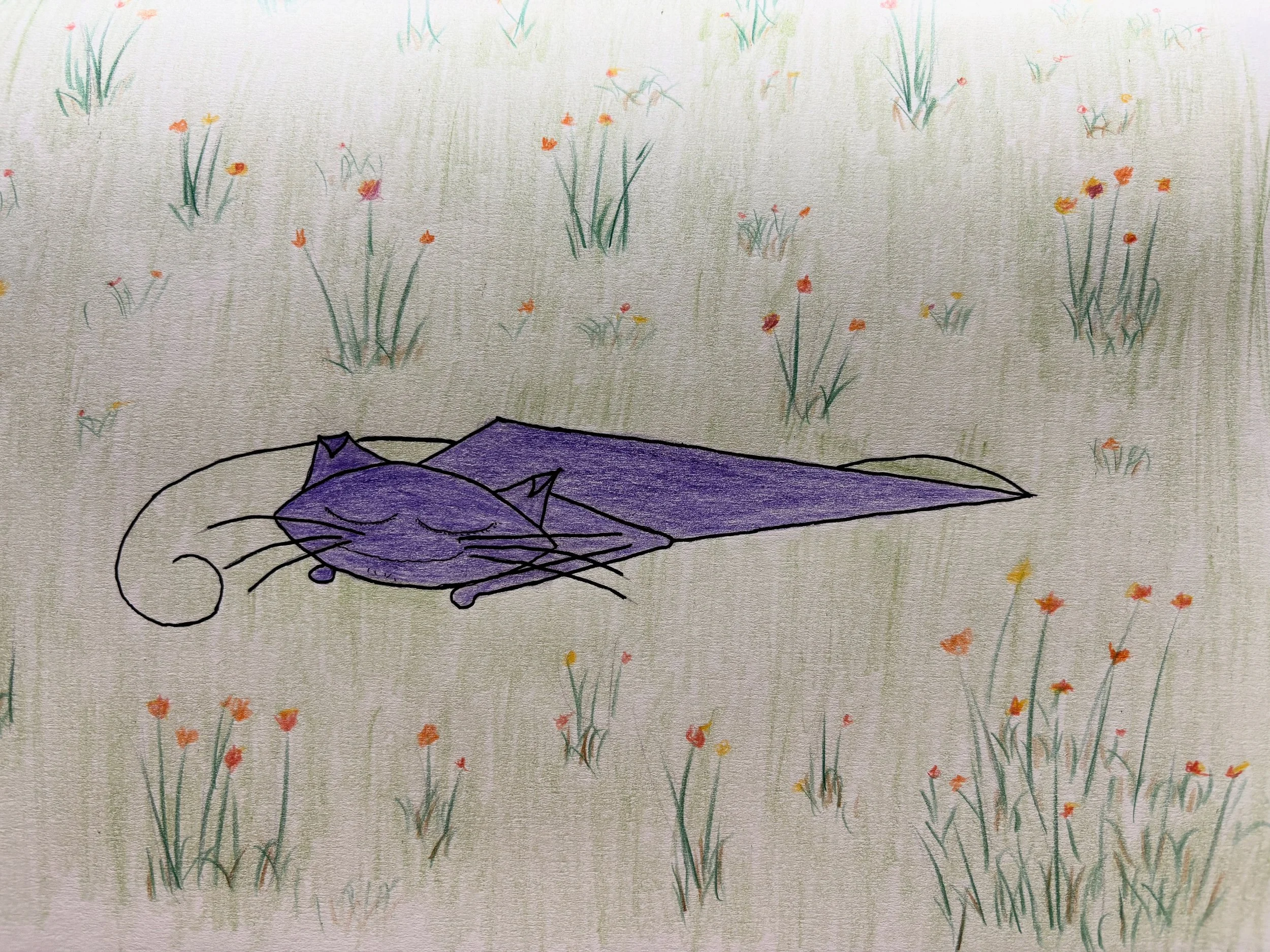 I wouldn’t exactly say it followed me home, but nowadays every day around 11 o’clock I have this cat at my back door looking to trade a story for some treats. I draw those stories and share them here.